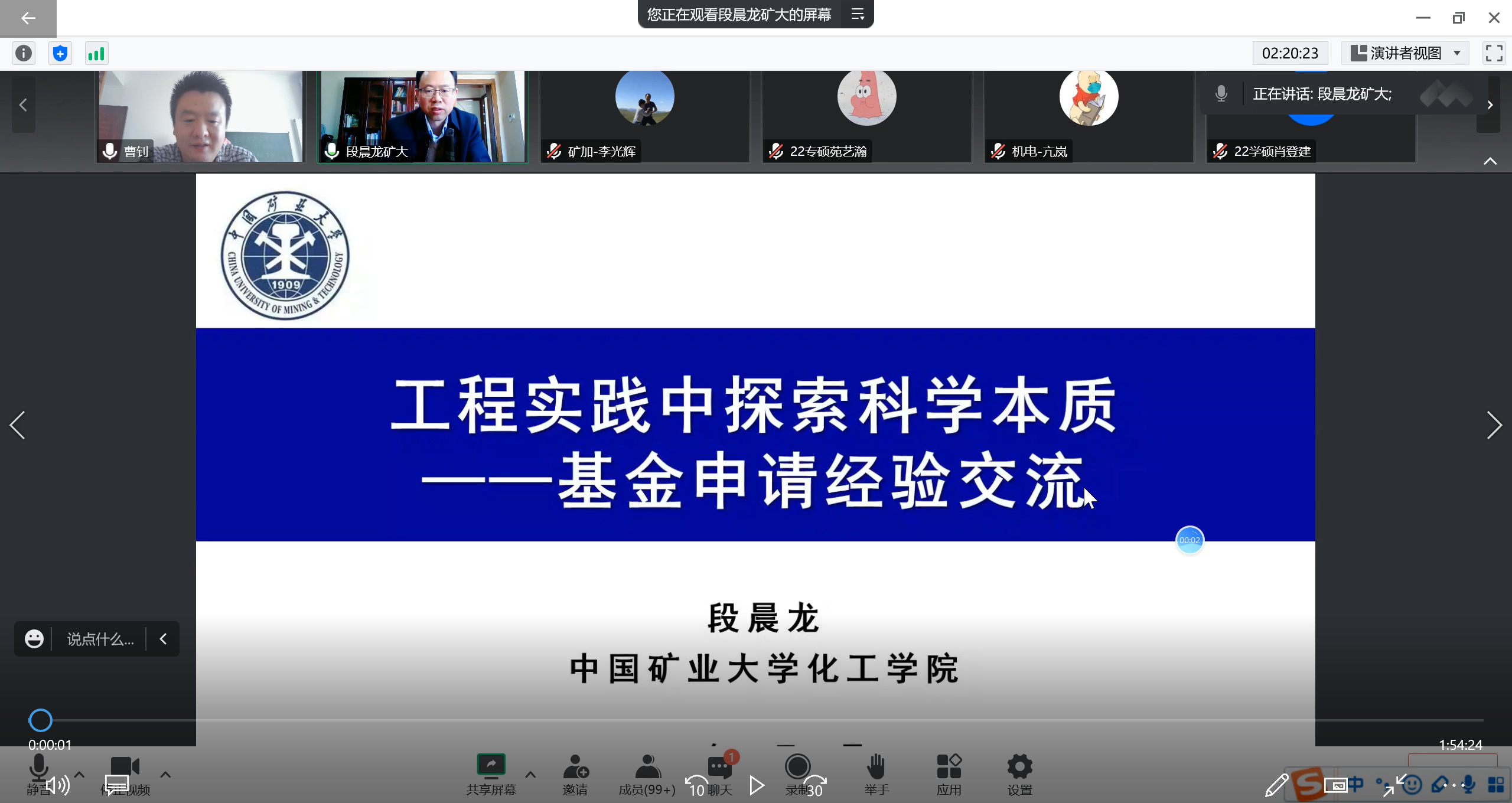 段晨龙教授从专家评审角度讲解了基金申报需要关注的重点,结合团队成员基金申报的实际成功案例,从基金选题、前期准备工作及申报书撰写等方面给与指导,分享了团队在筛分、干法选煤和二次资源综合利用方面的科研成果,最后与公司师生就科研发展与基金申报方面的问题进行深入交流。本次学术报告为公司科研工作与国家基金申报提供了良好的指导和借鉴作用。