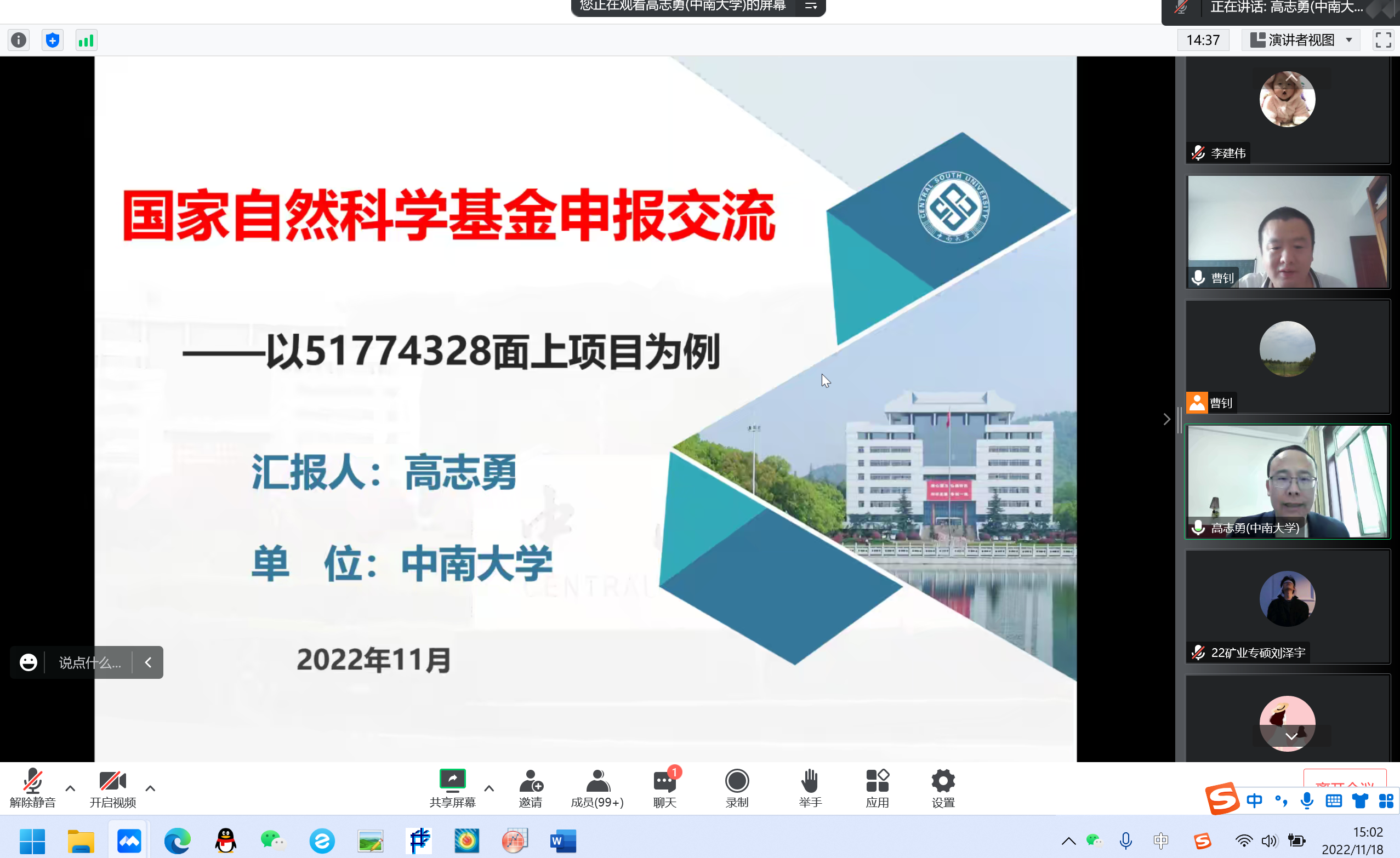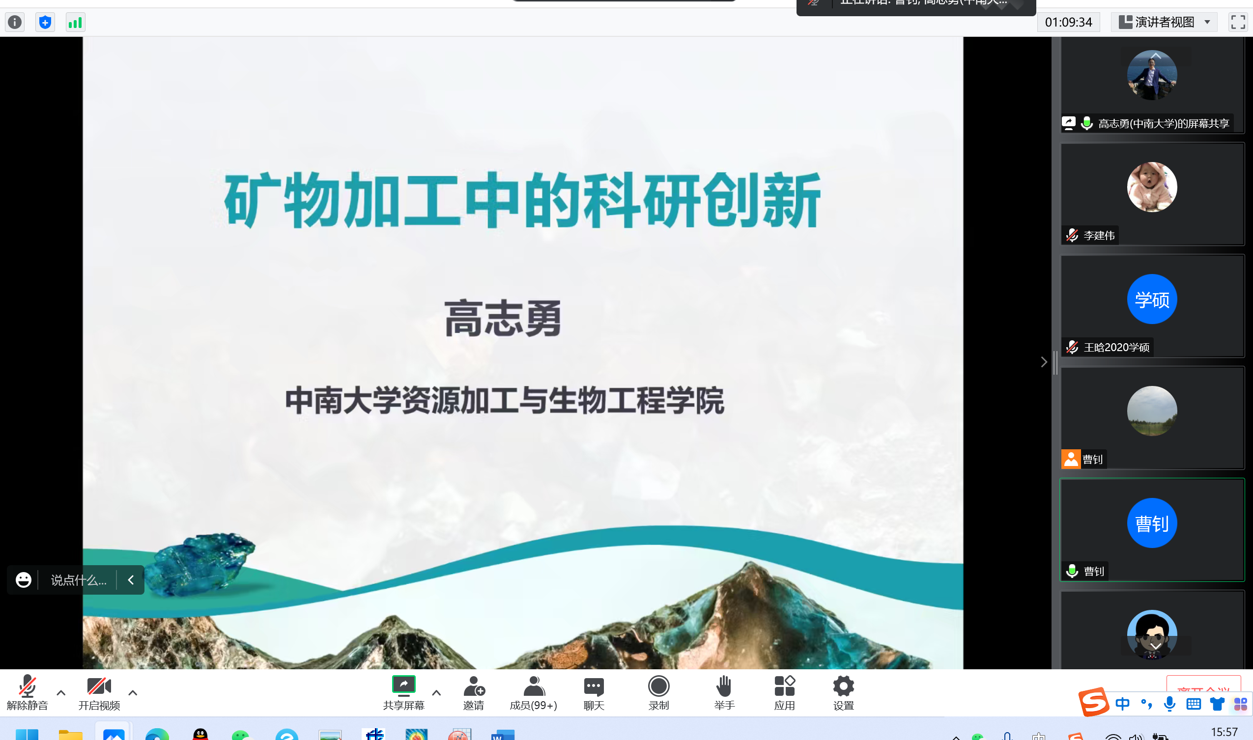 2022年11月18日下午,EMC易倍体育邀请国家“万人计划”科技创新领军人才、教育部青年长江学者、中南大学高志勇教授以线上会议形式作学术报告,两个报告题目分别为《国家自然基金申请与科研创新交流》和《矿物加工中的科研创新》,讲座由曹钊教授主持,公司200余名师生参加报告会。