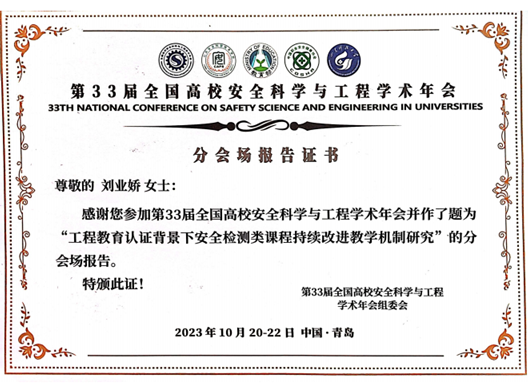 刘业娇应邀作了题为“工程教育认证背景下安全检测类课程持续改进教学”的分论坛报告,针对安全检测课程的教学方法、实践教学、团队队伍建设升、课程评价机制等内容与参会老师进行了现场交流和研讨。
