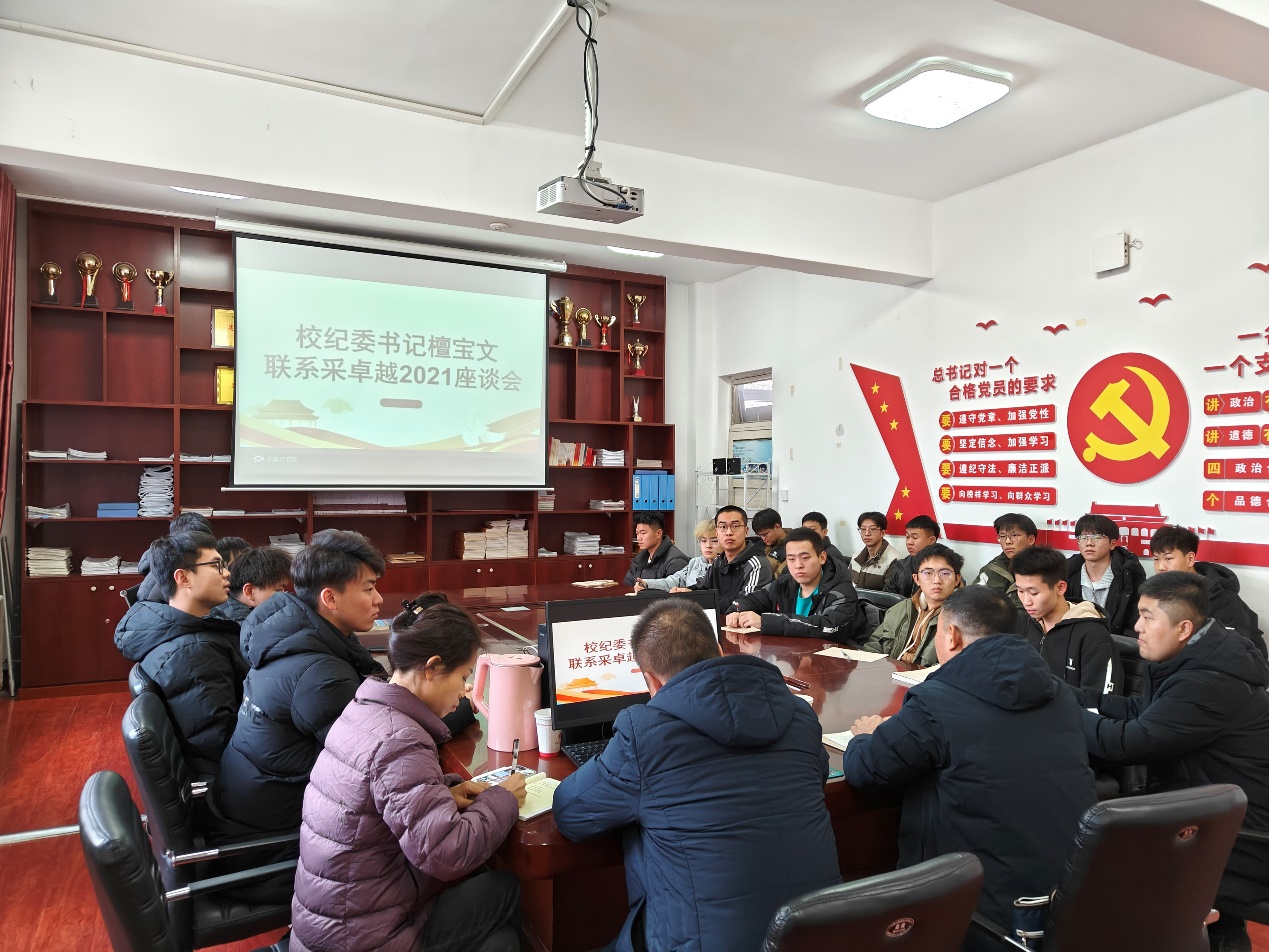 2023年11月15日,校纪委书记檀宝文与采卓越21全体员工在EMC易倍体育党员之家进行交流座谈。