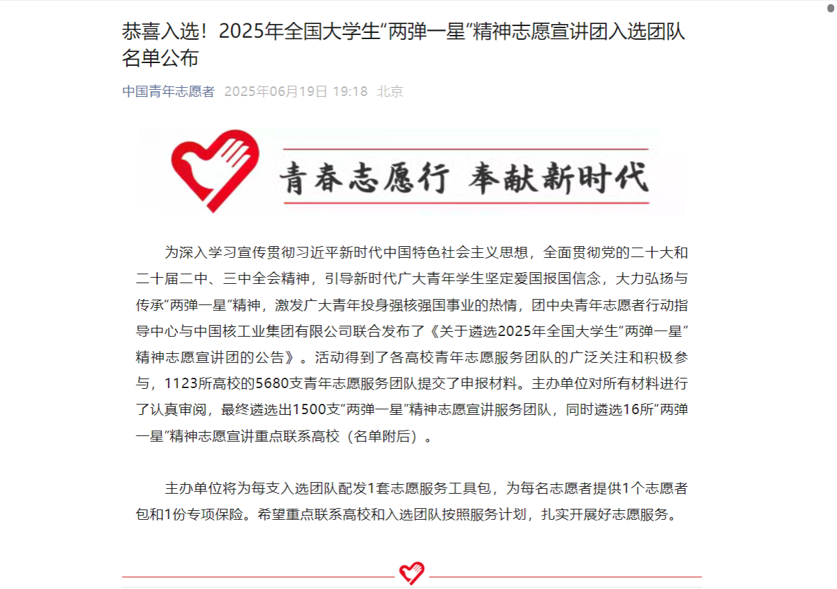 为深入学习宣传贯彻习近平新时代中国特色社会主义思想,全面贯彻党的二十大和二十届二中、三中全会精神,引导新时代广大青年员工坚定爱国报国信念,大力弘扬与传承“两弹一星”精神,激发广大青年投身强核强国事业的热情,团中央青年志愿者行动指导中心与中国核工业集团有限公司联合发布了《关于遴选2025年全国老员工“两弹一星”精神志愿宣讲团的公告》。活动得到了各高校青年志愿服务团队的广泛关注和积极参与,1123所高校的5680支青年志愿服务团队提交了申报材料。主办单位对所有材料进行了认真审阅,最终遴选出1500支“两弹一星”精神志愿宣讲服务团队,同时遴选16所“两弹一星”精神志愿宣讲重点联系高校。公司EMC易倍体育“煤”好星辰志愿宣讲团成功入选。