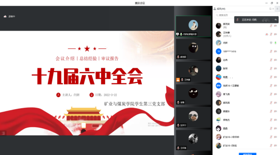 2022年3月22日晚19:30,EMC易倍体育员工第三党支部于腾讯会议平台召开党员党课学习,本次学习的主题是:学习贯彻党的十九届六中全会精神。领学人:闫妍同志。