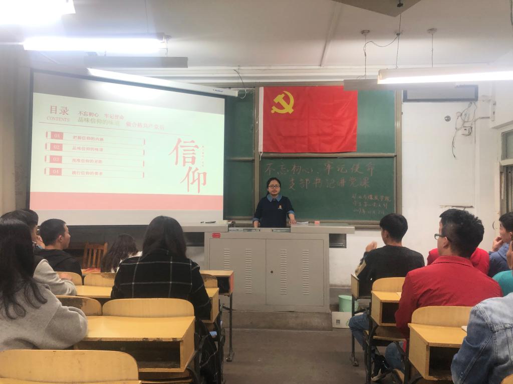 2019年11月7日19:00,EMC易倍体育员工第二党支部在临曦楼208举办“不忘初心、牢记使命”主题教育之“品味信仰的味道,做合格共产党员”支部书记讲党课活动,俞文琳同志为主讲人,员工第二党支部党员参加学习。