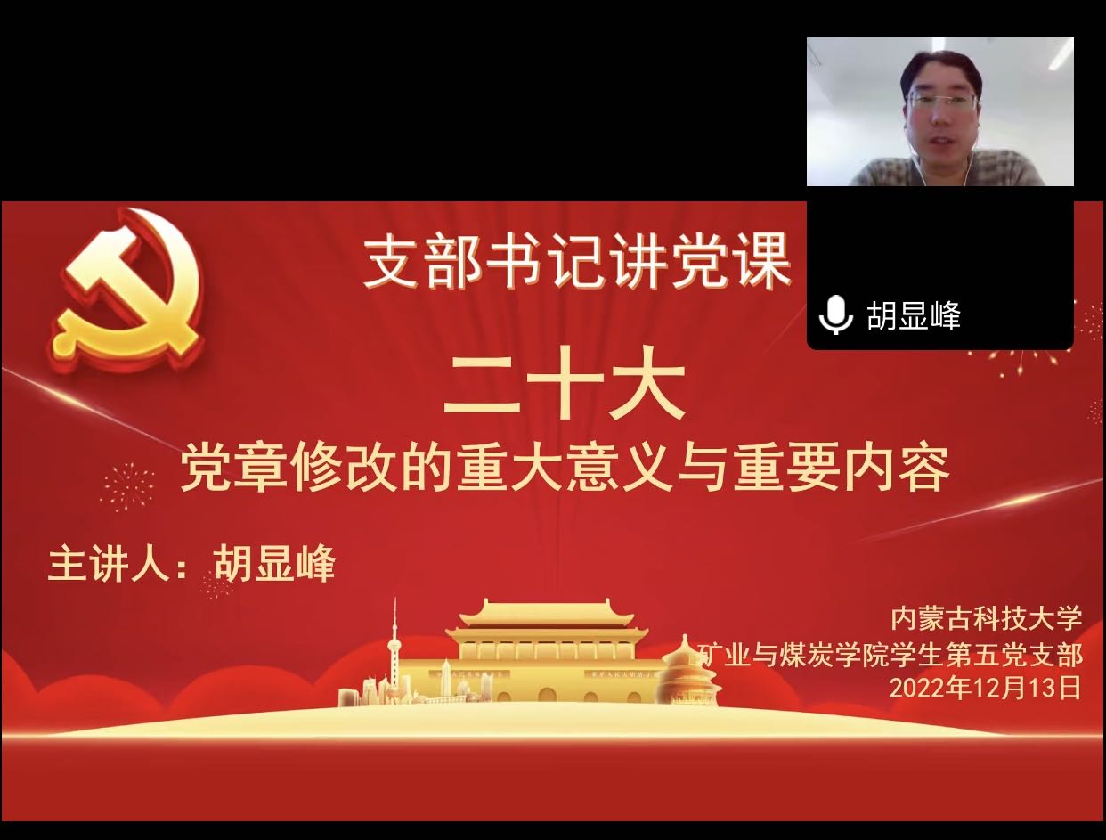 为引导广大党员深入学习贯彻党的二十大精神,更加自觉地学习党章、遵守党章、贯彻党章、维护党章,EMC易倍体育员工第五党支部于2022年12月13日组织开展支部书记讲党课,党课由支部书记胡显峰主讲,支部全体党员参加学习,本次学习利用腾讯会议线上开展。