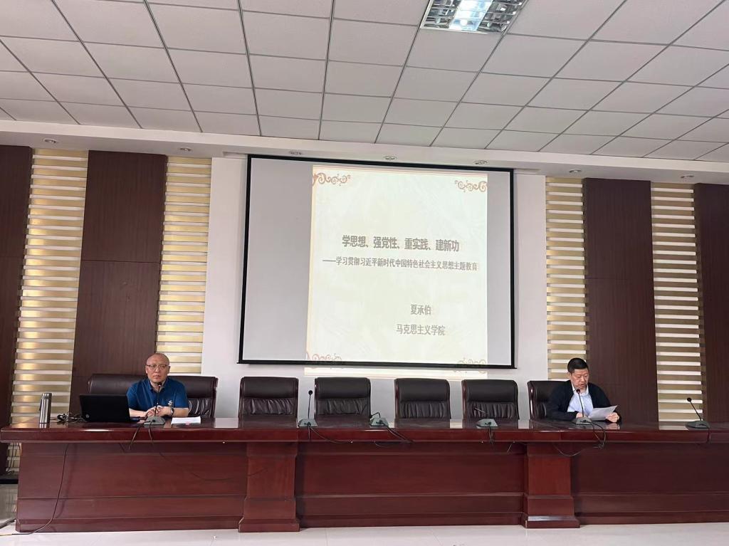 夏承伯以“学思想、强党性、重实践、建新功——学习贯彻习近平新时代中国特色社会主义思想主题教育”为题,从主题教育的重大意义与目标要求、习近平新时代中国特色社会主义思想的创立背景、核心要义、重要地位以及主题教育的工作安排与组织领导三个方面进行了重点阐述。