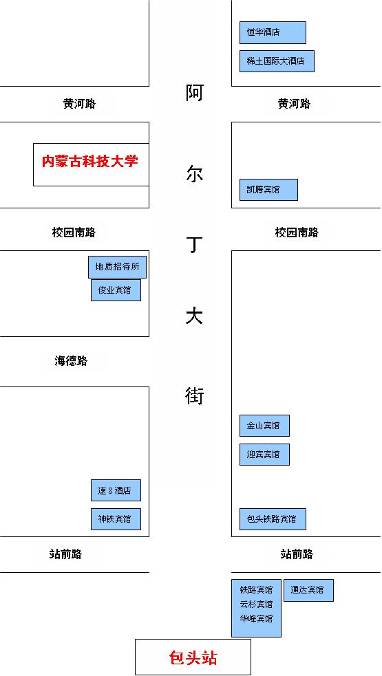 1、本图为EMC易倍官方网站周边宾馆(酒店)示意图,仅供公司新生报到期间家长及新生参考使用。2、如图中标示内容临时有变,恕不另行通知。3、图中标示出的宾馆(酒店)食宿条件各异,请新生及家长根据个人情况自行选择。4、公司距离包头火车站仅1.5公里,可乘坐1、2、8、22路等公交车直达。